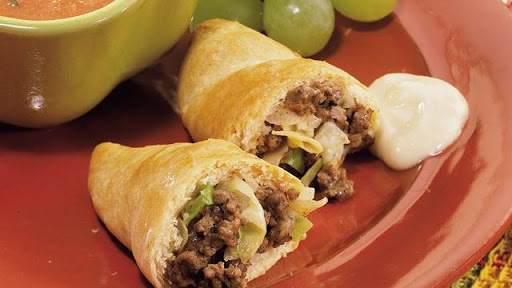 Separate dough into 16 triangles; press or roll each until slightly larger. Spoon about 1/4 cup beef mixture on shortest side of each triangle. Roll up, starting at shortest side of triangle, gently wrapping dough around beef mixture and rolling to opposite point. Pinch edges to seal. Place point side down on ungreased large cookie sheet.
