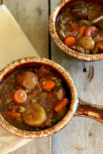 About 20 minutes before serving, add the peas (no need to defrost first), salt and pepper. In a small bowl whisk together the flour and remaining 1/2 cup of beef broth, creating a smooth paste. Stir into the stew. Replace the slow cooker cover and cook until thickened (about 15-20 minutes).