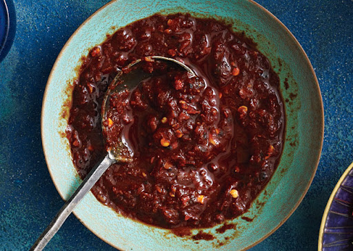Using kitchen scissors and working over a medium bowl, cut chiles into thin rings, reserving seeds. Cover with 2 cups very hot water and let soak for 10 minutes.