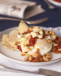 This is a lighter take on classic huevos rancheros, which can include plenty of refried black beans. In his version, Neal Fraser uses simmered whole white beans; here, the beans are mashed with ham to form the base of the dish, then piled with corn tortillas, fried eggs and queso fresco before broiling. A warm tomato salsa tops it all off.