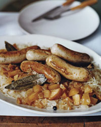 Sautéed German Sausages with Bacon and Apple Sauerkraut