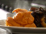 Prick the sweet potatoes all over with a fork, drizzle with olive oil and season with salt and pepper. Put them in a roasting pan and roast for 45 minutes until they are very soft. Remove the pan from the oven.