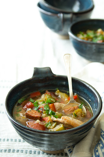 4. Add rosemary sprig, celery, bell peppers, okra and rice to the slow cooker and cover. Cook until the timer goes off and turn off heat if necessary. Discard rosemary sprig and stir in gumbo file. Do not continue to cook with file. Garnish with parsley.