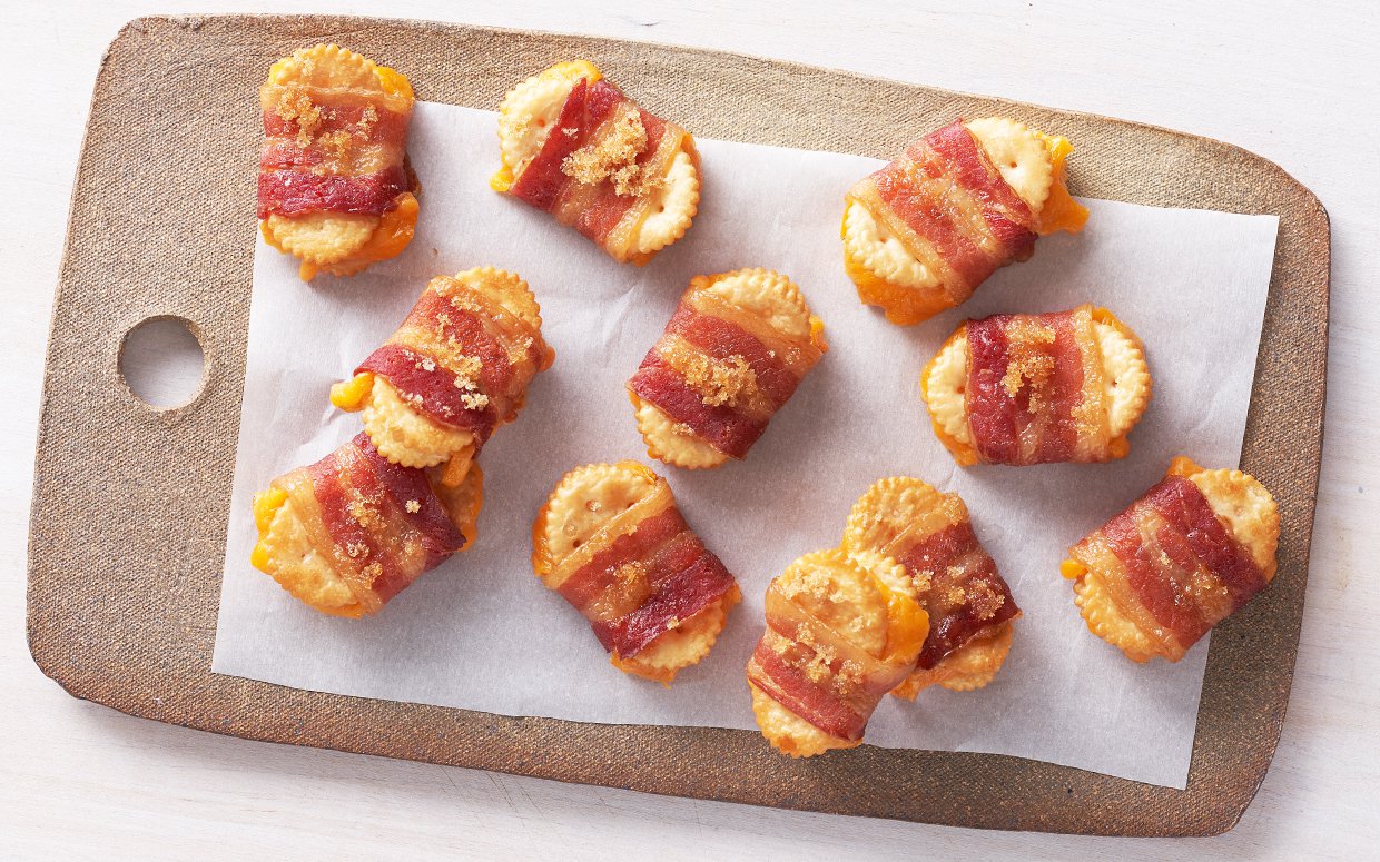 Preheat oven to 250°F. Line a baking sheet with parchment paper or aluminum foil. Place a wire cooling rack on top of the baking sheet (to allow bacon grease to drain). Sandwich together Town House Original Crackers and cheddar cheese slices. Carefully wrap each sandwich in ½ slice bacon; place on rack. Sprinkle evenly with about ⅓ cup brown sugar. Bake about 2 hours, or until bacon is crisp.