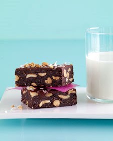 •Spread mixture evenly into dish. Spread reserved 1/3 cup chocolate over top. Finely chop remaining 2 tablespoons coconut and 2 tablespoons peanuts; sprinkle evenly over chocolate. Refrigerate until set, about 2 hours. Remove brownies from pan by lifting plastic wrap. Remove plastic, and cut into 24 brownies.