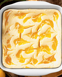 Bake the cheesecake for about 40 minutes, or until golden around the edge and just set. Run the tip of a knife around the edge to loosen the cheesecake from the side of the pan. Let cool on a wire rack for 1 hour, then refrigerate the cheesecake until thoroughly chilled. Cut into 16 bars and serve.