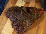 Slice the brisket across the grain (the muscle lines) at a slight diagonal. Serve with potato pancakes.