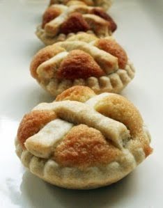 4) Roll out the pastry until around 5mm thick. Using a 3 inch cutter, cut rounds and press gently into a bun tin. Place a small amount of jam on top of the pastry then top with 1 tsp of the cake batter. Using the scraps place a cross of pastry on top of the batter.