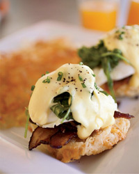 In her version of eggs Benedict, Tara Lazar swaps in applewood-smoked bacon for the usual Canadian bacon, because she prefers its rich flavor and crisp texture. At Cheeky’s, her restaurant devoted to breakfast and lunch, she serves the eggs on homemade cheddar-chive scones; the English muffins called for here are a tasty time-saver.