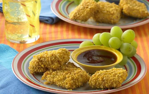 Dip the chicken into the egg mixture, then press firmly into the crushed corn flakes, coating both sides. Place the chicken on the prepared baking sheet. Bake for 5 minutes. Turn the chicken pieces over. Bake until the chicken is cooked through, 5–7 minutes longer.