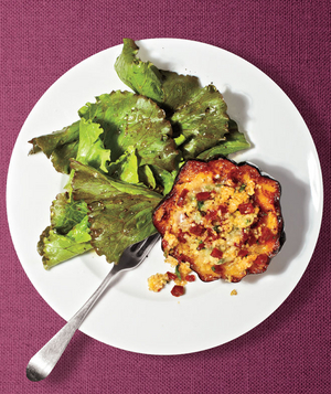 4. In a large bowl, whisk together the vinegar, the remaining 2 tablespoons of oil, and ¼ teaspoon each salt and pepper. Add the lettuce and toss to combine. Serve with the squash.