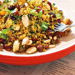 Just before serving, mix the quinoa, lemon juice, olive oil, toasted nuts, dried fruits, herbs and spices. Adjust seasoning with salt and fresh cracked black pepper.