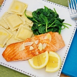 5. Slice salmon and divide among 4 plates. Add ravioli and spinach; pour pan juices atop. Serve with lemon wedges and Parmesan.