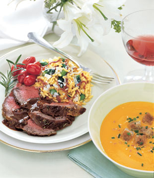 Leg of lamb is the centerpiece for this elegant spring meal. Accompany the lamb with a red Bordeaux or another full-bodied red, such as Burgundy or an aged Rioja. The pie needs to be chilled at least two hours before serving.