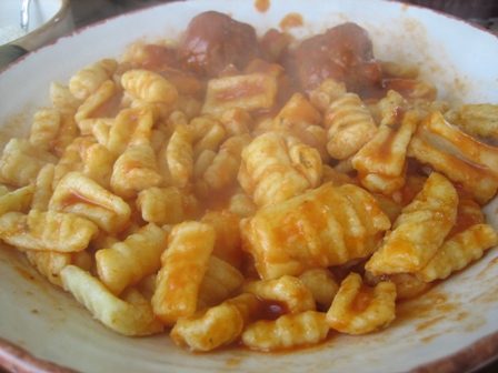 Keeping your work surface and the dough lightly floured, cut the dough into 4 pieces. Roll each piece into a rope about 1/2-inch in diameter. Cut into 1/2-inch-long pieces. Lightly flour the gnocchi as you cut them. You can cook these as is or form them into the classic gnocchi shape with a gnocchi board, ridged butter paddle, or the tines of a large fork turned upside down. Rest the bottom edge of the gnocchi board on the work surface, then tilt it at about a 45 degree angle. Take each piece and squish it lightly with your thumb against the board while simultaneously pushing it away from you. It will roll away and around your thumb, taking on a cupped shape — with ridges on the outer curve from the board and a smooth surface on the inner curve where your thumb was. (Shaping them takes some time and dexterity. You might make a batch just for practice.) The indentation holds the sauce and helps gnocchi cook faster.
