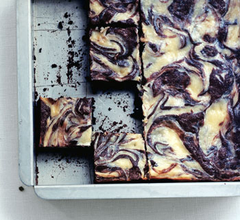 To create a swirl effect in the brownies, run a sharp kitchen knife through the batter without touching the bottom of the pan or lifting the knife up during its course. Slice through the chocolate dollops and drag some of the mixture into the cream cheese. Continue swirling until a spin-out, almost psychedelic pattern has formed.