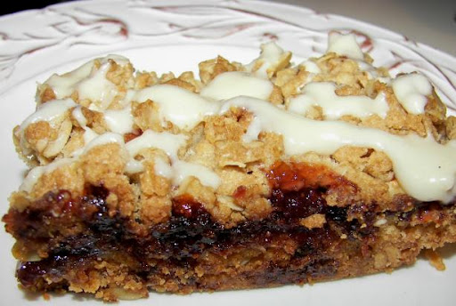 These are very nice sweet squares. A lovely buttery crumb mixed with homemade strawberry jam, topped with a drizzle of cream cheese frosting. Yummy, so good. Thanks very much for sharing this lovely treat.