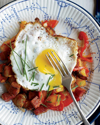 In another large nonstick skillet, heat the remaining 2 tablespoons of oil. Crack the eggs into the skillet and fry sunny-side up or over-easy. Spoon the hash onto plates and top with the eggs. Sprinkle with chives and serve right away.