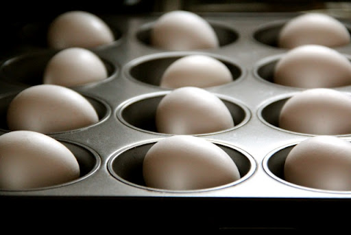 Preheat oven to 325. Place a dozen eggs into a standard 12-count muffin pan. Bake for 25-30 minutes. Let stand 5 minutes. Place cooked eggs into a cold water bath. The eggshells may have some brown spots on them after baking, but these will wash off easily in the water.