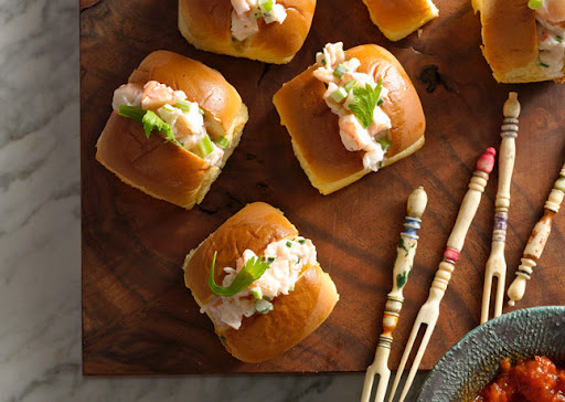A simple shrimp salad is served in small dinner rolls in this fun (and easy) twist on the traditional New England lobster roll.