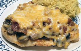 · Season the chicken with salt, pepper and paprika ( I am usually pretty generous with the paprika, I love the flavor). Stack two pieces of cooked bacon, crosswise on each chicken breast. Spoon the sauteed mushrooms onto the bacon, being sure to coat each breast evenly. Sprinkle 1/4 cup Monterey Jack cheese evenly onto each breast followed by 1/4 cup of cheddar.