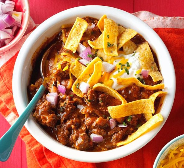 5. Top with chips. If desired, serve with sour cream, minced cilantro and additional onion.