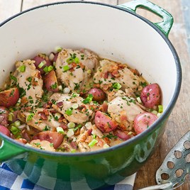 3. Return chicken and any accumulated juices to pot. Reduce heat to medium-low and cook, covered, until potatoes are tender and meat registers 175 degrees, about 25 minutes. Sprinkle with scallions, parsley, and remaining bacon. Season with salt and pepper. Serve.