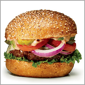 3. Place 1 lettuce leaf on bottom half of each hamburger bun; top with 1 patty, 1 onion slice, 2 tomato slices, about 2 avocado slices, 2 pickle chips, about 1 1/2 tablespoons sauce, and top half of bun.