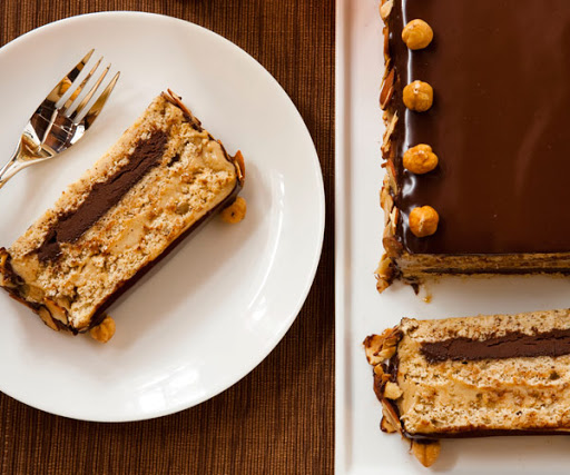 irst, you make a light meringue and quickly and gently fold in hazelnut and almond flour. Then you pipe three long rectangles of the meringue onto a baking sheet and bake them in a slow oven overnight, so they dry out and get crispy. A creamy espresso buttercream that tastes like soft coffee ice cream and a chocolate ganache filling are sandwiched between the layers. The cake is not difficult to make, but all of its components make it important to read the recipe from start to finish so you can organize your prep schedule. Each component can be made in advance, which makes the final assembly of the cake easier.