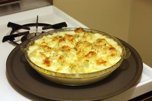 Steam cauliflower until crisp-tender. Transfer to a baking dish coated with cooking spray; set aside.