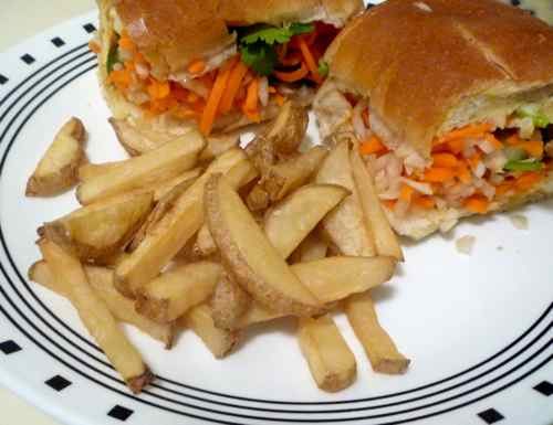 1) Scrub and dry potatoes. Slice width-wise into 1/2" disks, then slice disks into 1/2" strips. Place cut potatoes into bowl or zipper-seal bag.
