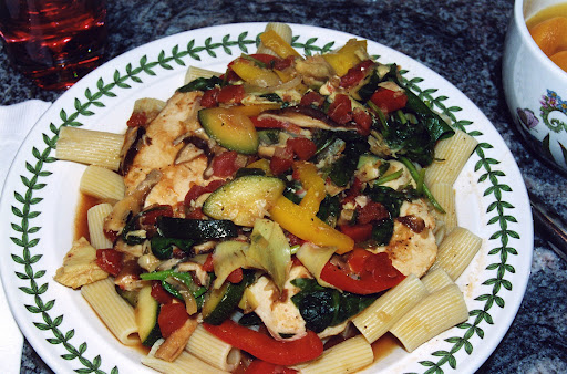 3.Remove chicken. Reapply olive oil spray. Sauté leeks, zucchini, peppers and mushrooms for 3 - 4 minutes.