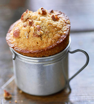 3. Spoon batter into prepared muffin cups, filling each two-thirds full. Sprinkle with remaining nuts. Bake in a 400 degree F oven for 15 to 18 minutes or until tops are golden and a wooden toothpick inserted in centers comes out clean. Cool in muffin cups on a wire rack for 10 minutes. Remove from muffin cups; serve warm. Makes 12 muffins.