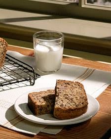 Beat butter, sugar, and egg in large bowl until fluffy. Combine bananas and milk in a bowl. Add to butter and sugar. Sift flour, baking powder and baking soda onto waxed paper. Stir into sugar mixture. Stir in nuts. Turn into prepared pan. Bake at 350 for 1 hour or until center springs back. Check edges during baking to see if edges are too browned. If so, add a foil tent.
