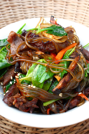 Chap Chae (Stir-Fried Sweet Potato Noodles With Beef, Spinach And Sesame Seeds)
