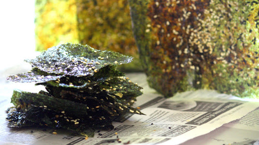 Re-whisk the syrup mixture. When the nori has cooled enough to handle, flip it over, brush the other side with the syrup and sprinkle with seeds and salt. Return to the oven for another 5 to 7 minutes. Remove it from the oven and let cool completely. Break it into large pieces and store in an airtight container. If it absorbs moisture from the air and gets floppy, toast it gently in the oven (at 200 degrees) to get rid of the moisture, and it cools to a crisp state again.