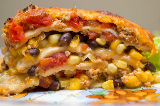 A yummy sauce packed with onion, red bell pepper and tomatoes is used, along with a filling of black beans, sweet corn, and cheddar cheese to make the lasagne-like layers. And what to use instead of pasta...? Well, soft flour tortillas are just perfect. They dissolve just enough to almost taste like soft cheese in between the layers. Who knew??