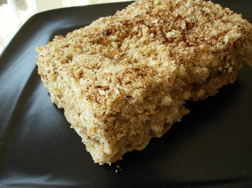 8. Spread pasta in baking dish and pour sauce to cover. (Will get dry pieces if some are left uncovered).