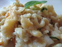 Bring large pot of salted water to boil. Working in batches, pour batter through slotted spoon held above boiling water, pressing with spatula to form strands. Stir gently to prevent sticking. Simmer until spaetzle float to surface, then continue cooking 1 minute longer. Using slotted spoon, transfer spaetzle to large buttered baking dish. (Can be made 2 hours ahead. Let stand at room temperature.)