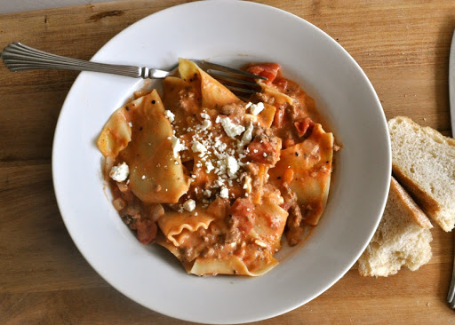 - 10 curly-edged lasagna noodles, broken into 2-inch lengths