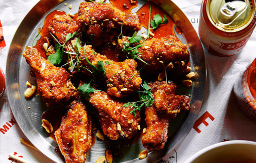 Working in 3 batches and returning oil to 350° between batches, coat chicken in batter, letting excess drip back into bowl, and fry until skin is golden and chicken is crisp and cooked through, about 5 minutes. Transfer to a wire rack set inside a baking sheet to drain. Using tongs, add hot wings to warm caramel, turn to coat, then transfer wings to a platter. Serve wings topped with peanuts and cilantro.