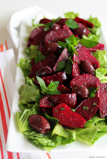 On a large platter (or small individual plates), spread the salad greens into an even layer. Spoon the beets and olives on top and serve immediately.