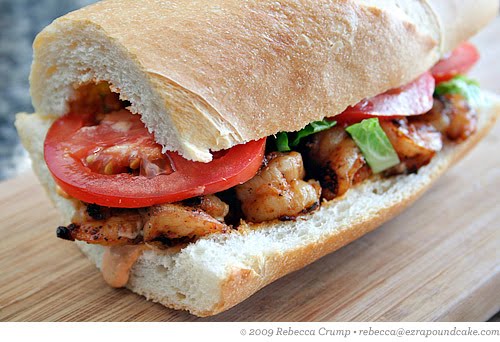 3. Place the shrimp on the bottom half of the baguette. Then pile on the shredded lettuce and tomato slices. Place the top half of the bread onto the sandwich, and divide the sandwich in half vertically to make two sandwiches.