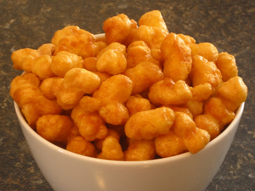 Combine brown sugar, butter, corn syrup, vanilla, & salt in saucepan. Boil for 5 min., stirring often. Remove from heat & stir in baking soda. Pour over puff corn in a lg. roaster, & stir well. Bake at 250° for 1 hr., stirring every 15 min. Cook on a cookie sheet or tin foil.