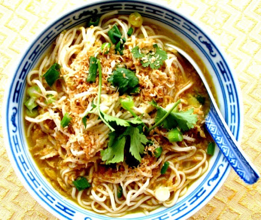 7. To serve, place some noodles in the bottoms of each serving bowl. Ladle soup over noodles. Garnish with cilantro and sliced chilies.