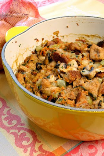 When the vegetables are soft, mix with the croutons. Transfer the mixture to a 9×12 baking dish and cover with foil. Bake for 25-30 minutes or until the liquid is absorbed, but the stuffing is still moist. Serve immediately.