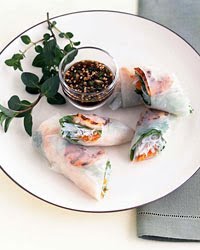 4. Soak 1 wrapper in hot water until pliable. Lay the wrapper on a cutting board and blot dry. Arrange 2 pieces of romaine on the bottom third of the wrapper. Top with some of the cellophane noodles, shrimp, mint, cilantro and carrot. Roll up the wrapper, tucking in the ends as you roll. Cover with a damp paper towel. Repeat with the remaining wrappers and fillings. Cut each roll in half and serve with the dipping sauce.