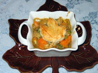 5. Preheat the oven to 350 degrees. In a small bowl, lightly beat the egg, egg yolk, 1 teaspoon water,and a pinch of salt. Transfer the filling to six individual ovenproof bowls or to one large shallow casserole and top with the frozen pastry. Brush the pastry with egg wash and fake for 30 to 45 minutes, or until the crust is golden.
