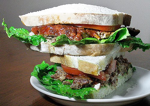 2. Break the beef and sausage into golfball-sized hunks and place them in a large, wide bowl. In a second large bowl, whisk together 3/4 cup ketchup with 1 1/2 tablespoons Worcestershire sauce and 3 teaspoons Tabasco sauce. Pour evenly over the beef and sausage. In the same bowl, mix the pickles, onion, garlic, and parsley, then scatter the mixture over the beef and sausage. Sprinkle the bread crumbs evenly over the top, then add the egg and the salt. With your fingers spread wide apart, gently mix the ingredients together in 6 to 8 gathering motions, until the ingredients begin to be uniformly blended.