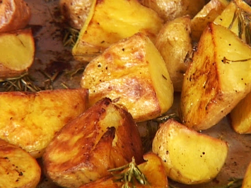 Put the potatoes onto a baking sheet. Roughly tear the rosemary and scatter it over the potatoes; season them with salt and pepper and drizzle with olive oil. Toss the potatoes well to mix all the flavors and put them in the oven. Remove them after 30 minutes and toss them again. Continue to roast them until they are browned and cooked through, about 30 to 40 minutes more. Serve immediately.